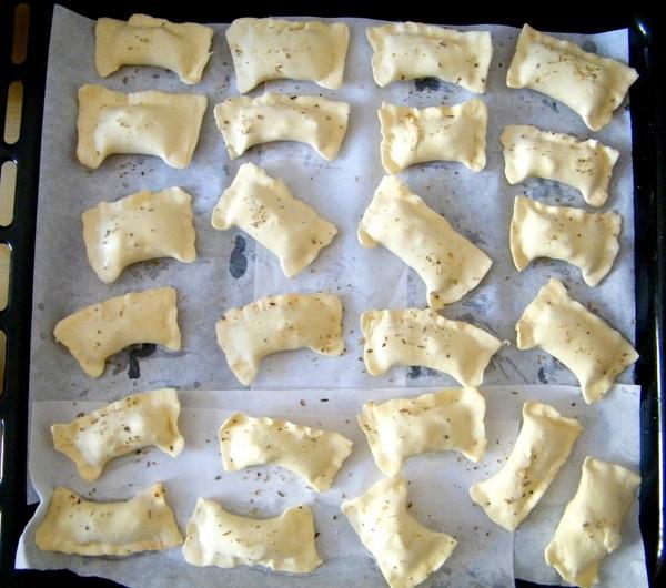 solą (nie za mocno).Pieczemy w piekarniku nagrzanym do ok. 200 stopni (chyba, że inaczej jest napisane na opakowaniu) przez 10 - 15 minut, kontrolując, żeby za mocno się nie przypiekły.Jeśli zostanie Wam farszu - wykorzystajcie go jako sos do