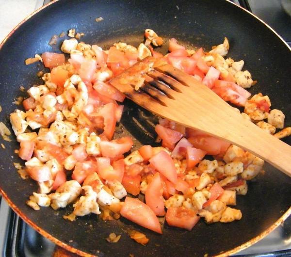 Pomidory kroimy w kostkę (możecie sparzyć, ale nie jest to konieczne) i dorzucamy na patelnię. Smażymy aż się rozpadną, po czym dolewamy