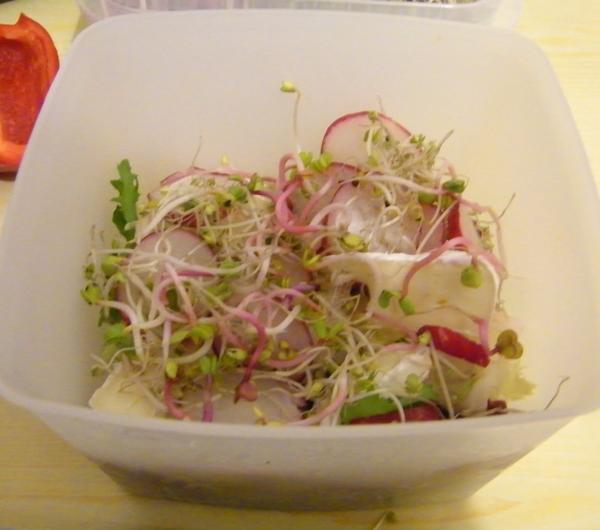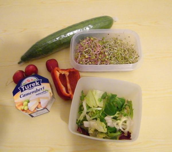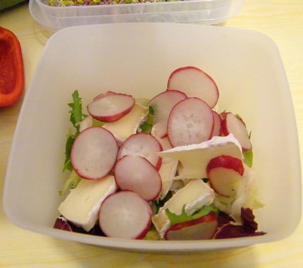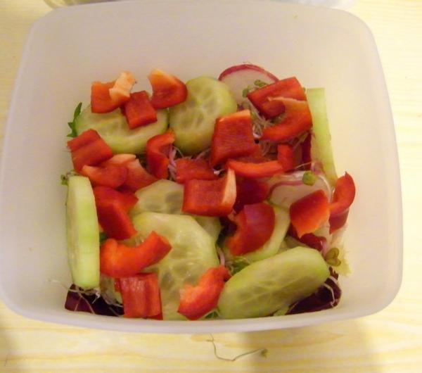 sałatkę. Wykorzystuję wszystkie warzywa jakie mam pod ręką i składniki, które się akurat nawiną. Jutro co prawda długo zajęć nie mam, bo ok. 14 powinnam być w mieszkaniu, ale nie wyobrażam sobie nie zjeść nic od samego rana (śniadanie wypadnie pewnie ok 6:30). Normalnie pewnie bym zrobiła