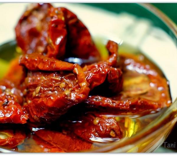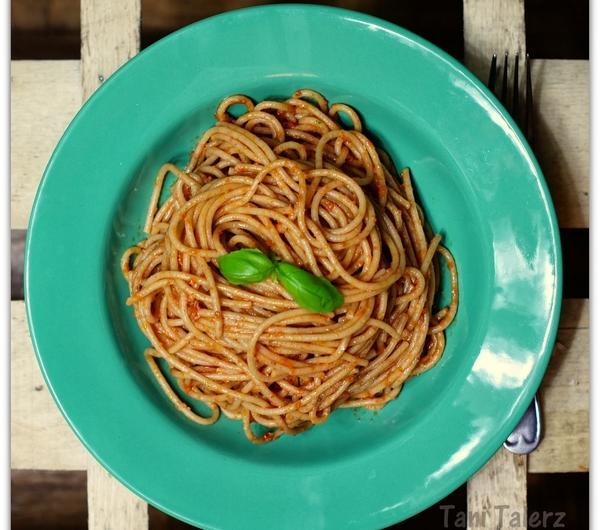 SKŁADNIKI:1 słoik suszonych czerwonych pomidorów50-60 g sera parmezan (lub innego podobnego)1 ząbek czosnkukilka lub killnaście listków świeżej bazyliigarść orzeszków pini (lub nerkowca)pół paczki makaronu spaghettisólWYKONANIE:Makaron gotujemy w osolonej wodzie aż będzie al dente.Wszystkie pozostałe składniki wkładamy do głębokiego naczynia i za pomocą bandera rozdrabniamy je na gładką masę. W razie potrzeby doprawiamy solą.Gorący makaron mieszamy dokładnie z pesto. Podajemy gorące.
