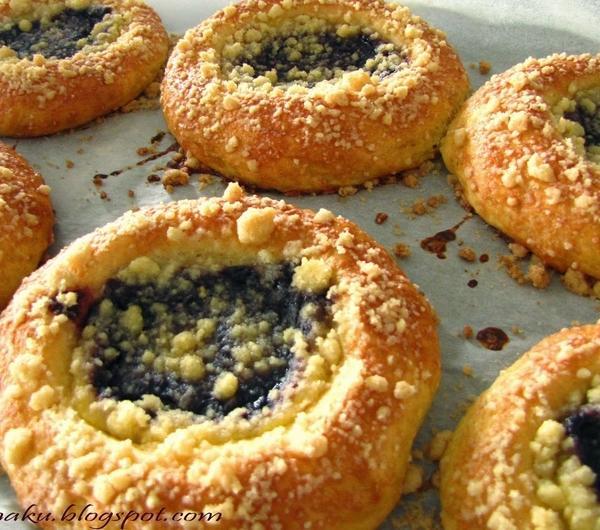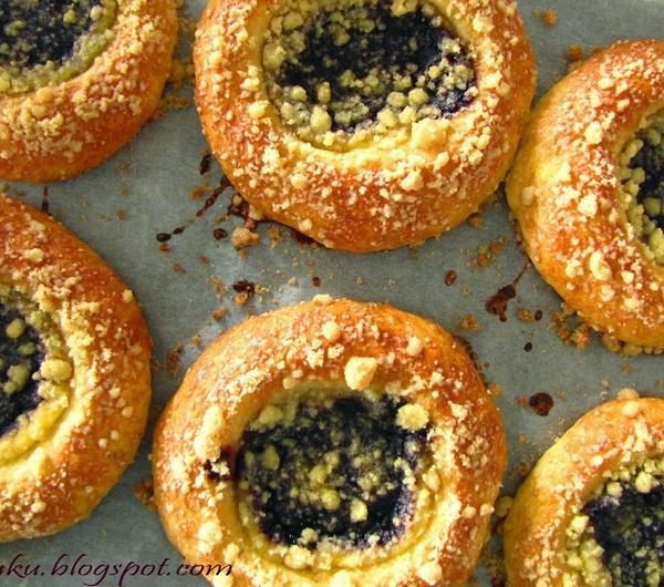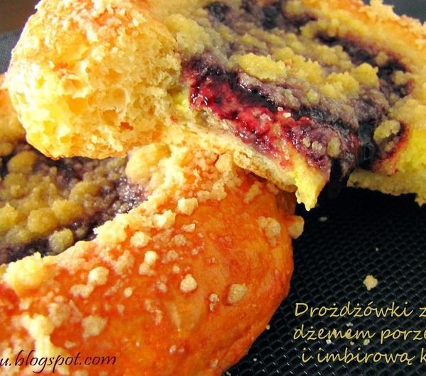 Kolejny przepis który musiałam przetestować na moim blogu. Przepis pochodzi z bloga "moje wypieki", jednak w oryginalnym przepisie użyty jest karmelizowany rabarbar, ja natomiast z braku rabarbaru użyłam dżemu z czarnej porzeczki który ostatnio robiłam. Najważniejsze w nadzieniu tych drożdżówek jest zachowanie równowagi pomiędzy słodkim, kwaśnym i prawie niewyczuwalną pikantną nutą jaką daje imbir. Dla ułatwienia można użyć gotowego budyniu waniliowego - najlepiej z prawdziwą wanilią.Składniki na 12 drożdżówek:500 g mąki pszennej tortowej (typ 450)300 ml mleka100 g roztopionego masła1 jajko20 g świeżych drożdży (w oryginalnym przepisie można zamienić je na 10 g suszonych, ale ja nie próbowałam)2,5 łyżki cukruszczypta soli (tj. 1/4 łyżeczki)Składniki na budyń:300 ml mleka3 żółtka50 g cukru waniliowego20 g mąki pszennej20 g mąki ziemniaczanejSkładniki na kruszonkę:1/2 szklanki mąki pszennej tortowej5 łyżek cukru1 łyżeczka zmielonego imbiru60 g roztopionego masłaDodatkowo:dżem z czarnej porzeczki 150 - 200 g (lub dżem z jakichkolwiek kwaśnych owoców)1 jajko roztrzepane z łyżką mleka do posmarowania bułeczek przed pieczeniemWykonanie:Drożdże wymieszać w 100 ml ciepłego mleka (nie gorącego) i dodać łyżkę cukru, następnie chwilę poczekać, aż drożdże ruszą (pojawią się bąbelki, piana itp.) Zaczyn mamy gotowyMąkę wymieszać z zaczynem i pozostałymi składnikami (oczywiście jeżeli zrobimy zaczyn to do mąki dodajemy tylko 200 ml mleka i 1,5 łyżki cukru). Wszystkie składniki dobrze wyrobić, pod koniec dodać roztopione masło i dalej wyrabiać. Ciasto zagniatać, aż będzie miękkie i elastyczne (całe wyrabianie ciasta trwa ok. 20-30 min). Ciasto uformować w kulę i włożyć w lekko wysypaną mąką miskę. Przykryć ściereczką i odstawić w ciepłe miejsce, aż do podwojenia objętości (ok. 1,5 godz.)Budyń: W naczyniu zmiksować 100 ml mleka z resztą składników. Pozostałe 200 ml mleka doprowadzić do wrzenia, następnie dodać zmiksowaną mieszankę i zagotować jak jak budyń z torebki, cały czas mieszając do zgęstnienia. Gotowy budyń przełożyć do miseczki i przykryć folią spożywczą, tak aby folia dotykała budyniu. WystudzićKruszonka: Wszystkie składniki wyrobić pomiędzy palcamiDwie płaskie blachy (te od piekarnika) wyłożyć papierem do pieczeniaJak ciasto wyrośnie jeszcze raz krótko wyrobić i podzielić na 12 części. Uformować kulki - bułeczki, następnie ułożyć na blachach w sporych odległościach (ja ułożyłam 6 na jednej blasze). Pozostawić drożdżówki do ponownego wyrośnięcia. (ok. 40 min.)Po drugim wyrośnięciu w każdej drożdżówce zrobić wgłębienie za pomocą dna szklanki (prawie do samej blachy), w każde zagłębienie nałożyć 1-2 łyżki budyniu i 1-2 łyżeczki dżemu porzeczkowego. Następnie posmarować brzegi drożdżówki roztrzepanym jajkiem z mlekiem i posypać kruszonką.Piec w temp. 190 C ok. 20-25 min. Drożdżówki wystudzić na kratce.SmacznegoZdjęcia miały być na każdym etapie tworzenia drożdżówek niestety baterie padły w aparacie:-/