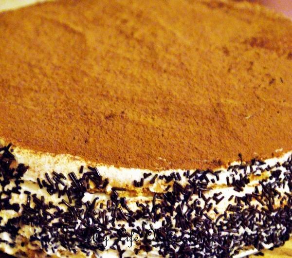 składniki na biszkopt:- 4 jajka- nie cała szklanka cukru- nie cała szklanka mąki- 1,5 łyżeczki proszku do pieczeniaskładniki na krem:-serekmascarpone 500g-śmietanka 30%250ml-3łyżki cukru pudru-likier amaretto- 50ml mocnej kawy-kakao do posypania-wiórki czekoladowe-laska waniliisposób wykonania:Białka ubijamy na sztywną pianę dodajemy cukier ciągle miksując i dodajemy rozbełtane żółtka do masy jajecznej dodajemy mąkę wymieszaną z proszkiem do pieczenia.Ciasto wylewamy na średnią tortownicę,posmarowaną tłuszczem i posypaną bułką tartą.Pieczemy w 185stopniach około 35minut.uchylamy piekarnik aż biszkopt wystygnie.Teraz bierzemy się za krem.Śmietanę miksujemy,aż będzie sztywna,dodajemy stopniowo serki zmniejszając obroty.Dodajemy laskę wanilii i 3 łyżki cukru pudru.Ostudzony biszkopt przekrawamy równo od góry .Dolną część biszkopta nawilżamy kawą zmieszaną z likierem amaretto, na nasączony biszkopt nakładamy krem i smarujemy również boki,ale zostawiamy odrobinę kremu na wierzch ciasta.Nakładamy górną część biszkopta i smarujemy pozostałym krem.Posypujemy kakao a boki wiórkami czekoladowymi.Wstawiamy do lodówki na około 30 minut.(w sezonie można na wierzch ułożyć świeże maliny)Smacznego