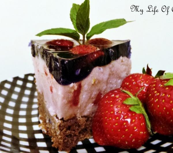 truskawki pokrojone w ćwiartki.Wszystko zalewamy lekko stężoną