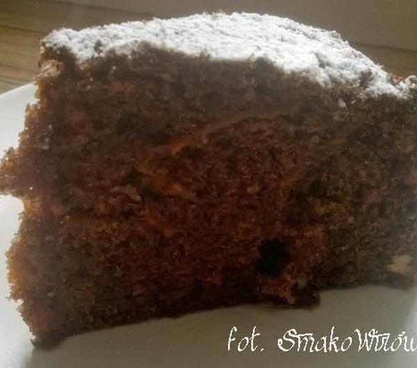 Składniki:- 4 jajka- 1 szklanka cukru brązowego- 1/2 szklanki cukru białego- 1 szklanka oleju- 2 szklanki mąki- 2 szklanki marchewki startej na tarce do jarzyn - duże oczka- 2 łyżeczki proszku do pieczenia- 2 łyżeczki sody oczyszczonej- 2 łyżeczki cukru waniliowego- 2 łyżki kakao- 1 łyżeczka cynamonu- 1 łyżeczka przyprawy korzennej ( lub 1/2 łyżeczki imbiru i 1/4 łyżeczki gałki muszkatołowej)- 1/2 łyżeczki soli- szklanka orzechów włoskich (lub bakalii)- cukier puder do posypaniaPrzygotowanie:Jajka utrzeć z cukrem na puszystą masę. Podczas mieszania wlać powoli olej. Za pomocą łyżki wmieszać suche składniki. Na końcu delikatnie dodać marchew i orzechy. Przelać do blachy wysmarowanej masłem i posypanej mąką i piec około 50 minut w temperaturze 180 stopni (do suchego patyczka). Ostudzone posypać cukrem pudrem.