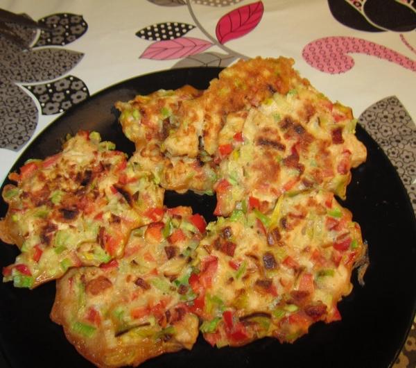 Składniki(6 kotlecików):-około 120 gr kurczaka-1/2 czerwonej papryki-1/2 żółtej papryki-1 mały por-1 mała cukinia-jajko-około 3-4 łyżek skrobi kukurydzianej-przyprawyPrzygotowanie:1.Kurczaka kroimy w bardzo drobną kostkę, tak samo papryki.2. Pora kroimy w paseczki.3.Cukinie obieramy ze skórki i również kroimy w drobną kostkę.4.Wszystko wrzucamy do miseczki, dodajemy jajko, mieszamy.5.Następnie dorzucamy skrobię kukurydzianą, ilość taką żeby się skleiło wszystko ze sobą.6. Dorzucamy przyprawy u mnie był to czosnek i ostra papryczka, i mieszamy dokładnie7.Warto odstawić to na pół godziny do lodówki, żeby się mocniej połączyło.8. Następnie smażymy na patelni na małym ogniu do uzyskania złotego koloru.( ja smażę na takim psikanym oleju do beztłuszczowego przygotowywania potraw, ale nie jest to konieczne).Smacznego:)
