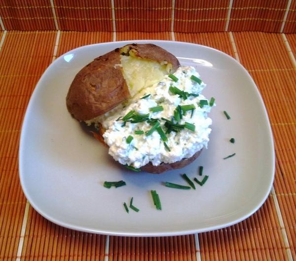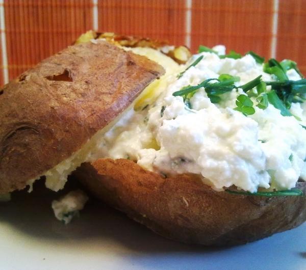 100g twarogu2 łyżki jogurtu typu greckiego lub śmietanyszczypiorekpół cebulisól, biały pieprz2 ziemniakiTwaróg rozdrabniamy, łączymy z jogurtem, dodajemy posiekany szczypiorek i drobno pokrojoną cebulkę. Przyprawiamy solą i białym pieprzem.Ziemniaki gotujemy lub pieczemy w piekarniku. Ziemniaki możemy ugotować lub upiec w mundurkach. Gotowe ziemniaki kroimy na pół i nakładamy na nie gzika.