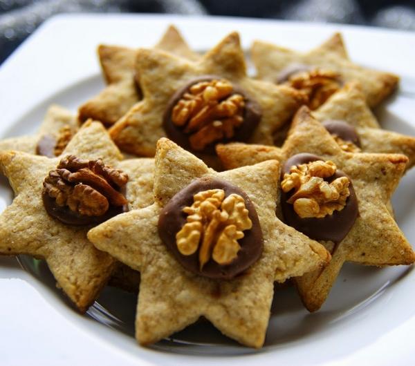 orzechów włoskichW misce zagnieść wszystkie składniki.Wstawić do lodówki na ok 15 minut.Rozwałkować na grybość ok 3 mm i wykrawać dowolne kształty.Piec ok 12 minut w temp 180 stopni Celsjusza.