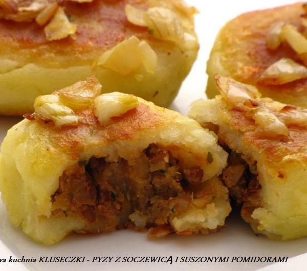 wody. Z masy ziemniaczanej odrywać małe kawałki, spłaszczać na dłoni, nakładać farsz i formować - najpierw kulkę, a następnie lekko ją spłaszczyć. Smażyć na złoto z obu stron na sklarowanym