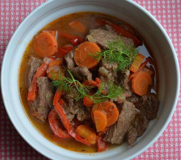 SKŁADNIKI na 4 porcje500 g-700 g wołowiny2 cebule1 papryka2 marchewki500 ml bulionu wołowego250 ml czerwonego wina2 ząbki czosnkuprzyprawy1 łyżeczka słodkiej papryki w proszku1 łyżeczka tymianku1 łyżeczka imbiru1 łyżeczka mąkichillisólpieprzJAK TO ZROBIĆMięso kroimy w kostkę lub paski i podsmażamy na oleju, przekładamy do garnka. Cebule kroimy w pół krążki, smażymy, aż się zarumieni. Usmażoną cebulę przekładamy do garnka z mięsem, podlewamy bulionem i winem. Dusimy na małym ogniu przez 1,5 godziny. Na pół godziny przed końcem gotowania dodajemy pokrojoną w krążki marchewkę, słodką paprykę i czosnek. Na 10 minut przed końcem gotowania dodajemy pokrojoną w paski paprykę, imbir i tymianek. Mąkę mieszamy z 60 ml zimnej wody, dodajemy do mięsa z warzywami i zagotowujemy. Na koniec dosmaczamy solą, pieprzem i chili.