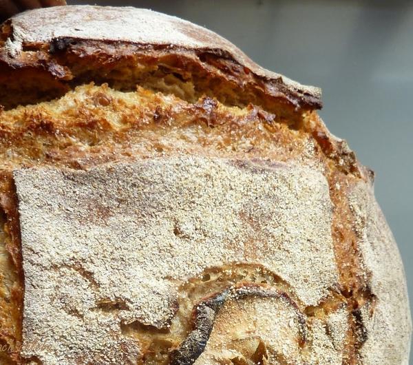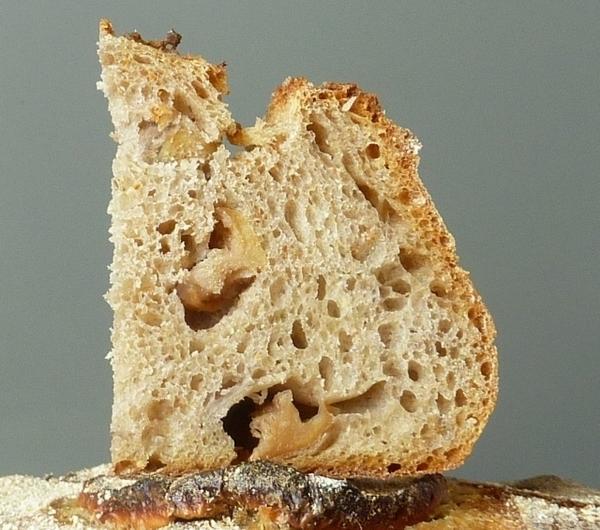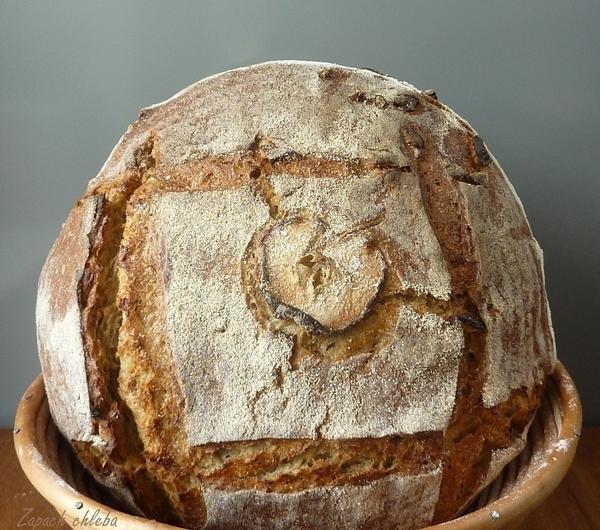 (przepis tatter)450 g mąki chlebowej80 g mąki gryczanej80 g mąki żytniej 2000280 g wody16 g soli480 g zakwasu pszennego100 g jabłek suszonych pokrojonych w duże kawałki200 g cydru jabłkowego100 g orzechów włoskich grubo pokrojonychJabłka zalać cydrem na dwie godziny. Odsączyć.Wszystkie składniki ciasta chlebowego oprócz jabłek i orzechów połączyłam w jednolita masę. Wyrabiałam przy pomocy robota, hakiem 5 minut. Następnie ciasto wyłożyłam na blat i wyrobiłam dokładnie rękami. Pod koniec wgniotłam jabłka i orzechy. Ciasto odstawiłam w natłuszczonej misce do wyrośnięcia na 2 godziny i w międzyczasie raz odgazowałam. Uformowałam bochenek i przełożyłam do kosza. Ja na wierzchu przykleiłam plaster suszonego jabłka i jabłkiem do wewnątrz ułożyłam bochenek w koszu. Po około dwóch godzinach upiekłam chleb na gorącym kamieniu. Najpierw 15 minut w 230 stopniach z parą, a potem bez pary jeszcze 20 minut. Jabłko na szczycie bochenka osłoniłam pergaminem i innym grubym plastrem jabłka, aby jabłko na chlebie się nie spaliło.