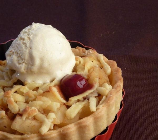 To już ostatni moment, żeby kupić na targu szarą renetę. Dłużej już nie da ich się przechowywać. Późno dojrzewają, pod koniec października, i potem towarzyszą nam do końca zimy. To owoce starej odmiany, uprawianej w Polsce od XIX w. Niezbyt atrakcyjna w wyglądzie jest szara reneta pysznym, kwaśnym, soczystym jabłkiem idealnym na szarlotkę, czy chociażby takie małe, szybkie do wykonania tarty z kawałkami jabłek w środku.Jabłka obrałam, pokroiłam w małą kostkę i poddusiłam chwilę w maśle z odrobina cukru. Tylko chwilę, żeby jabłka soku nie puściły. Doprawiłam nowa przyprawą do dań słodkich, którą dostałam już zaopatrzoną w młynek. Bardzo przyjemny aromat ma ta przyprawa. W składzie oprócz skórki cytrynowej, kardamonu i cynamonu jest też goździk i , co ciekawe, mięta. Niestety pierwszym składnikiem jest cukier. To chyba na wypadek, gdyby ktoś wbrew producentowi chciał ją zastosować do dań...niesłodkich. No i jeszcze wyciąg z kurkumy. Dlaczego wyciąg a nie kurkuma? Czepiam się?Kruche ciasto do tart, szarlotek, mazurków20 dag masła35 dag mąki (wskazana krupczatka ale może być też tortowa)2 żółtka8 dag cukru pudru1 łyżeczka esencji waniliowej.Zimne masło pokrojone w kostkę, mąkę i cukier siekam w malakserze na drobna kruszonkę, dodaję żółtka, esencję i jeszcze chwile mieszam. Wszystko wysypuje do miski i rękami szybko zlepiam ciasto w kulę. Przykrywam folia i odstawiam do lodówki na godzinę.Z tej porcji ciasta wyszło pięć tart o średnicy 12 cm.Zanim wypełniłam je jabłkami podpiekłam je, z obciążeniem 15 minut w piekarniku w temp. 200 stopni. Potem piekłam je jeszcze 10 minut.Podałam z własnej produkcji lodami waniliowymi. Posypałam dodatkowo cynamonem.