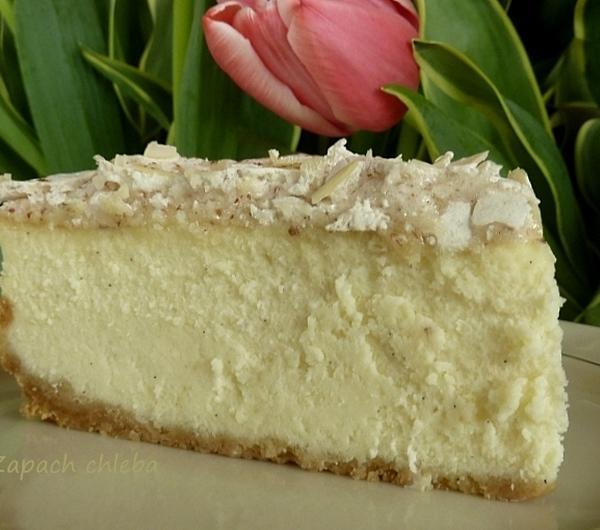 450 g twarogu tłustego200 g gęstej śmietany 36%200 g gęstej śmietany 18%35 g mąki ziemniaczanej15 g kaszy mannej130 g cukru3 jajka3 żółtka3/4 łyżeczki esencji migdałowejBeza2 białka120 g cukru3 łyżki zmielonych migdałów2 łyżki mąki ziemniaczanejkilka kropli esencji migdałowejTwaróg przecisnąć przez praskę. Dodać śmietany, cukier i za pomocą blendera dodatkowo wygładzić masę serową. Przełożyć do miski miksera, dodać jajka i żółtka. Wymieszać krótko wiosłem na średnich obrotach. Dodać mąkę, kaszę manną i esencje migdałowa i ponownie wymieszać na gładka masę.Przelać do przygotowanej tortownicy ze spodem przygotowanym tak jak tutaj . Wstawić do piekarnika nagrzanego do 170 stopni i piec przez 15 minut. Zmniejszyć temperaturę do 120 stopni i piec jeszcze 45 minut. W między czasie przygotować bezę.Białka ubić dokładnie z cukrem na bardzo sztywną pianę. Można dodać odrobinę winianu potasu lub kilka kropel cytryny. Do ubitej piany dodać zmielone migdały i esencję. Wymieszać całość delikatnie łyżką.Masę bezową wyłożyć na gorący sernik. Zmniejszyć temperaturę w piekarniku do 100 stopni i piec całość jeszcze 45 minut. Ostudzić sernik w otwartym piekarniku. Ponieważ pod moją bezą utworzył się pęcherz powietrza pokruszyłam ją czubkiem noża, co dało bardzo ciekawa i smaczną dekorację.