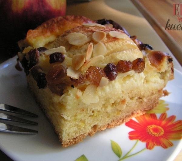 Przepis na prostokątną blachę 22x34 cm.Na placek:40 dag mąki pszennej15 dag cukru15 dag masła3 jajkaskórka otarta z cytrynyNa masę śmietanową:ok. 8 kwaskowych jabłek (trzeba sobie wyliczyć, ile się zmieści na blaszce połówek jabłka)sok z cytryny2 szklanki 18% śmietany3 jajka1 torebka budyniu śmietankowego lub waniliowego10 dag cukruDo posypania:płatki migdałowesparzone i osączone rodzynkiPrzesiać do miski mąkę i wymieszać ją z proszkiem do pieczenia i szczyptą soli. Dodać posiekane masło, cukier, skórkę z cytryny (ja drobniutko pokroiłam) i 3 jajka, zagnieść ciasto. Zawinąć je w folię aluminiową i odłożyć na 30 minut do lodówki. Następnie wyjąć, rozwałkować - na mniej-więcej taką wielkość, jak blaszka. Wyłożyć ciasto na blaszkę, wyłożoną papierem do pieczenia i równomiernie rozłożyć na spodzie.Jabłka obrać, przekroić na połówki, wydrążyć gniazda nasienne, ponacinać od góry (w formie "wachlarza") i skropić sokiem z cytryny. Rozłożyć je na cieście.Śmietanę wymieszać z cukrem, proszkiem budyniowym i jajkami. Zalać ułożone na cieście jabłka. Całość posypać płatkami migdałowymi i rodzynkami.Moja kuchenka jest stara, elektryczna, mocno grzeje. Placek piekłam bez termoobiegu w 180'C: przez 40 minut z opcją pieczenia tylko od dołu, kolejne 20 minut z opcją góra-dół. Ciasto przed wyjęciem sprawdzić patyczkiem.