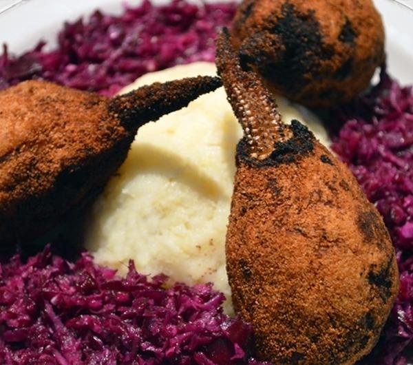 Wykonanie:Ziemniaki obieramy i gotujemy. Gnieciemy na papkę do której dodajemy trochę mąki kukurydzianej i przyprawy do kurczaka. Formujemy kulki, w które wkładamy kolby kukurydzy i ukształtowujemy, aby wyglądały jak pałki z kury. Obtaczamy w kaszy mannie i smażymy na głębokim oleju.