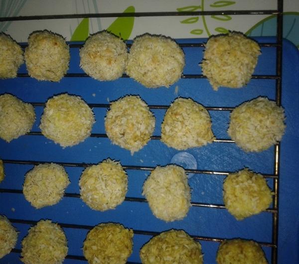 W misce rozgnieść banana wraz z jajkiem, aby się połączyły, dodać do tego płatki owsiane(otręby) oraz wiórki kokosowe,widelcem ugniatać aż wszystkie składniki się skleją . Dodać jogurt i likier kokosowy dalej mieszając masę. Jeśli masa jest za rzadka dodać mąkę. Ewentualnie jeśli ktoś woli słodszą wersję można dosłodzić cukrem pudrem.W wilgotnych dłoniach robić małe kuleczki. Gotowe kulki włożyć do miseczki z wiórkami i obtoczyć dokładnie.