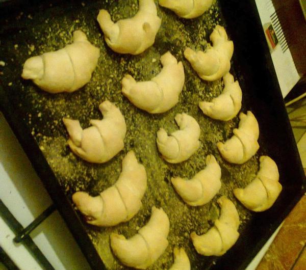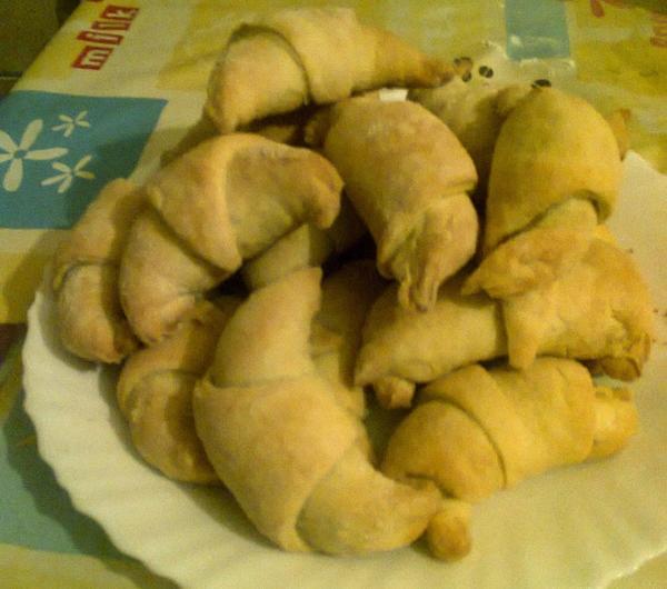 Składniki:Ciasto:50 g drożdży1/2 kostki margaryny2 jajka500 g mąki1/2 szklanki mlekaszczypta solicukier waniliowyNadzienie: marmolada / czekoladaPolewa: cukier puder / lukier / polewa czekoladowaPołączyć składniki na ciasto. Zagnieść. Wstawić na 2 godziny do lodówki. Podzielić na 4 części. Części rozwałkowywać na kształt koła. Pociąć na trójkąty, czyli na pół, na pół i na pół czyli 1/8 :D Na środku większego końca trójkąta położyć ok. łyżeczkę marmolady (lub więcej w zależności od wielkości ciasta) lub 1, 2 kostki czekolady. Zwinąć do środka koła. Gotowe rogaliki ułożyć na papierze lub folii na blasze. Nagrzać piekarnik do 160 stopni. Piec ok. 40 min. Ostygnięte polać lukrem, polewą lub posypać cukrem pudrem.Smacznego! :)