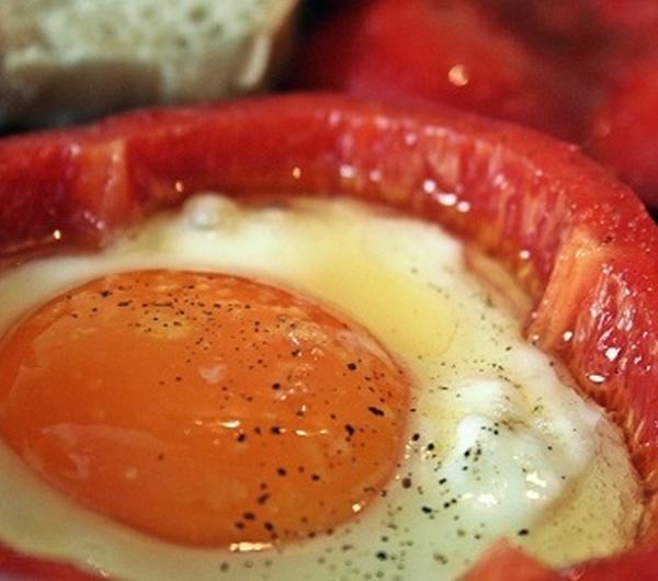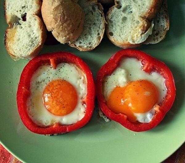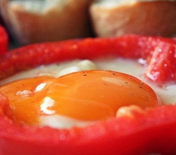 Bardzo proste i smaczne śniadanie. Smaczne, efektowne, pożywne, szybkie.Składniki:1 czerwona papryka2 jajka1 bułka pszennałyżka masłałyżka olejuząbek czosnkusól i pieprzPrzygotowanie:Bułkę pokroić w małe kromeczki, tłuszcz rozgrzać na patelni. Z papryki wykroić dwa 1,5 cm plastry i usmażyć z jednej strony, po czym obrócić i wbić do każdego plastra po jednym jajku ( delikatnie, żeby jajko się nie rozlało ). Bułkę ułożyć na patelni i piec z obu stron razem z jajkami i papryką. Ścięte jajka w papryce wyłożyć na talerz i doprawić solą i pieprzem. Grzanki natrzeć z obu stron przekrojonym czosnkiem.Z sokiem pomarańczowym, idealne śniadanie na niedzielny poranek :)