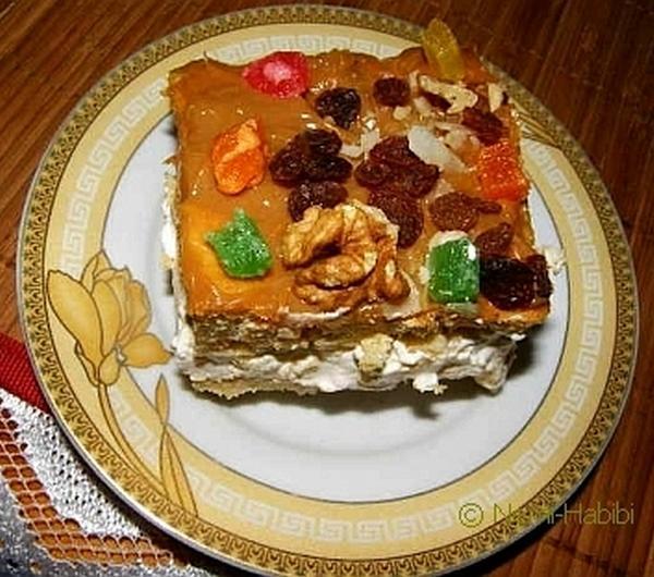 Składniki:50 dag mąki pszennej1/2 szklanki cukru pudru15 dag miodu1/2 kostki margaryny2 jajkaOpakowanie cukru wanilinowego (dałam 1/2)1 łyżka sody oczyszczonej (zastąpiłam proszkiem do pieczenia)1/2 l śmietany 36%Galaretka owocowaPuszka słodzonego mleka skondensowanego (dałam gotową masę toffi)Ulubione bakalieZ podanych pierwszych siedmiu składników zagniatamy ciasto, dzielimy je na dwie równe części. Margaryną smarujemy dwie identyczne formy lub wykładamy je papierem do pieczenia. Ciasto przekładamy do form i pieczemy 15 min. w 200 st. C (lub robimy jak napisałam wyżej).Mleko w puszce wstawiamy do garnka z wodą i gotujemy trzy godziny (lub kupujemy gotową masę i pilnujemy się, aby jej nie wyjeść od razu;).Galaretkę rozpuszczamy w szklance wody.Śmietanę ubijamy na puszystą masę i dodajemy do niej ostudzoną galaretkę.Kremem śmietankowym przekładamy ostudzone placki, wierzch ciasta smarujemy toffi i posypujemy bakaliami.Odstawiamy do lodówki, najlepsze jest następnego dnia.Smacznego!