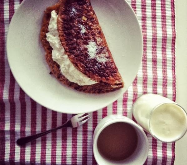 Białka i jajko rozbijamy widelcem lub mikserem z mlekiem, kakao i słodzikiem/ cukrem wanilinowym. Rozgrzewamy teflonową patelnię i wylewamy na nią jajeczną masę. Smażymy z każdej strony do ścięcia się jajek. W międzyczasie rozgniatamy widelcem razem składniki nadzienia do uzyskania jednolitej konsystencji.Usmażony omlet wykładamy na talerz. Na połowie wykładamy nadzienie i składamy na pół. Idealne śniadanie w połączeniu z kawą dla osóļ dbających o linię i nie tylko!