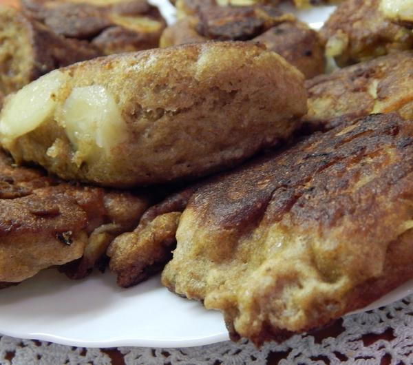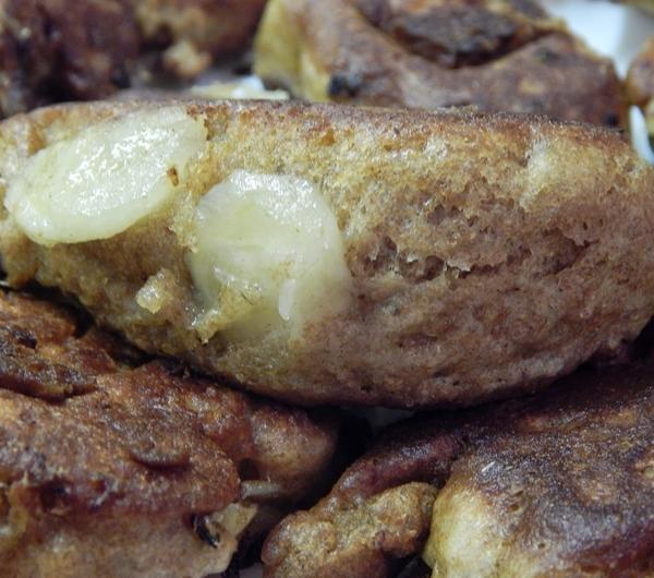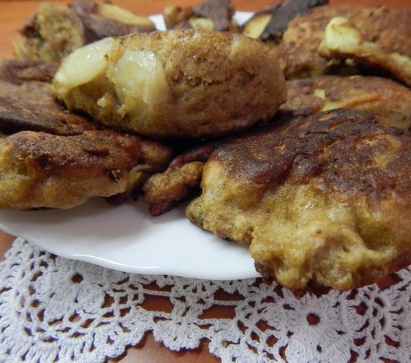 jabłko w półplasterki i dodajemy do ciastaPlacuszki nakładamy dużą łyżką i smażymy na najmniejszym ogniu zostawiając pomiędzy nimi odległość. Bardzo ładnie rosną w górę i są puszyste. Podczas smażenia patelnię przykrywamy. Smażymy do uzyskania ciemnego, brązowego koloruMożna posypać