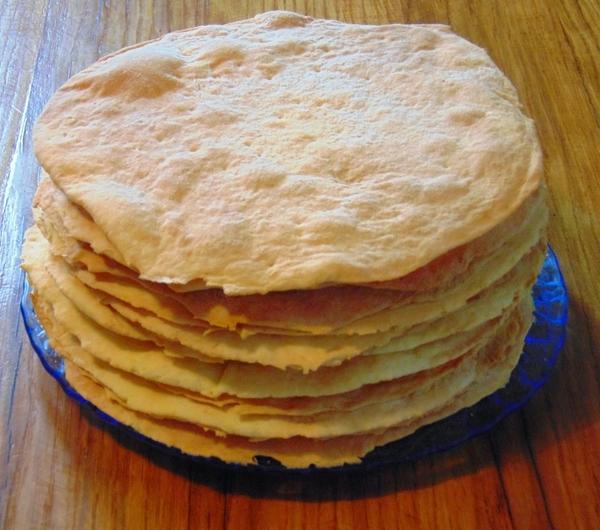 Bardzo cieniutko rozwałkować każdą część i piec na dużej (30 centymetrowej ) tortownicy, na jasno złoty kolor, w 180 stopniach. Okrawki które nam zostają od formowania ciasta na tortownicy, upiec i pokruszyć.