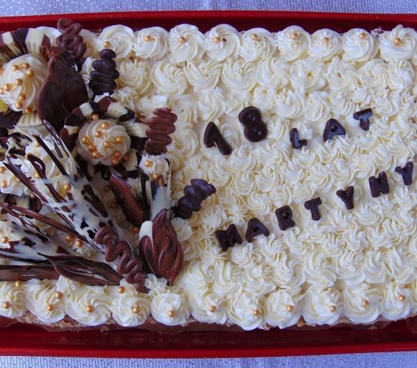 czekoladą, dekorujemy zostawioną białą masą lub innymi dekoracjami.