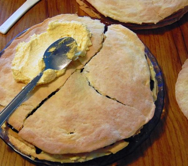 Krążki ciasta smarujemy dwoma łyżkami masy, dwie warstwy.