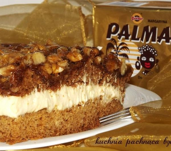 SKŁADNIKINa ciasto:50 dag mąki pszennej;20 dag margaryny Palmy z Murzynkiem *20 dag cukru;2 jaja;2 łyżki miodu naturalnego;2 łyżeczki sody oczyszczonej;2 łyżki mleka.Na masę orzechową:20 dag orzechów włoskich grubo posiekanych;2 łyżki miodu;13 dag margaryny Palmy z Murzynkiem;10 dag cukru.Na krem:2 szkl. mleka;25 dag margaryny Palmy z Murzynkiem;¾ szkl. cukru;2 łyżeczki cukru wanilinowego;3 łyżki mąki ziemniaczanej;3 łyżki maki pszennej;2 żółtka.Dodatkowo:słoiczek kwaśniejszego dżemu.WYKONANIEPrzygotowanie ciasta.Mąkę przesiewamy. Dodajemy rozpuszczoną w mleku sodę oraz pozostałe składniki. Zagniatamy ciasto, które dzielimy na 2 części. Jedną część wykładamy na blachę (ja użyłam blachy o rozmiarach 23x35 cm). Pieczemy w temperaturze 170 0 stopni do momentu zezłocenia się wierzchu. Drugą część ciasta pieczemy z masą orzechową.Przygotowanie masy orzechowej.Wszystkie składniki wkładamy do rondelka i zesmażamy na złoty kolor. Gorącą masę kładziemy na drugą część ciasta. Pieczemy ok. 15 min do tzw. suchego patyczka.Przygotowanie kremu.Do kubeczka odlewamy 0,5 szklanki mleka, dodajemy mąkę pszenną, ziemniaczaną i żółtka. Dokładnie mieszamy. Resztę mleka zagotowujemy z cukrem i cukrem wanilinowym. Do gotującego mleka wlewamy masę mączno-żółtkową. Gotujemy do momentu, aż masa stanie się gęsta. Odstawiamy do ostygnięcia. Margarynę ucieramy na puch i dodajemy po łyżce zimnego budyniu.Przekładanie ciasta.Pierwszy placek smarujemy dżemem, na to kładziemy krem budyniowy i przykrywamy ciastem z orzechami.*Polecam użyć PALMY Z MURZYNKIEM z Bielmaru jest to pełnotłusta margaryna, produkowana od 40 lat według tej samej receptury. Dodatek oleju palmowego wyróżnia ją na tle innych margaryn kulinarnych. Jego trwałość i odporność na wysokie temperatury decyduje o przydatności do pieczenia i smażenia. Palma z Murzynkiem nadaje ciastu pożądaną konsystencję i kruchość, zapewnia też dłuższą świeżość. Ważne jest też to, że nie znajdziemy w niej środków konserwujących, jak i cholesterolu.
