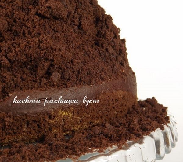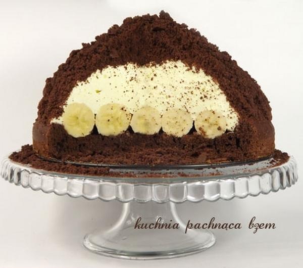 SKŁADNIKINa ciasto12,5 dag masła;1,5 szklanki mąki pszennej;5 łyżek mleka;0,5 szklanki cukru;2 łyżki kakao;3 jajka;3 łyżki ekstraktu waniliowego;1 łyżeczka proszku do pieczenia;1 łyżka cukru wanilinowego.Na krem0,5l śmietanki 36%;1 galaretka cytrynowa;4 banany;sok z cytryny.WYKONANIEMasło, cukier,mleko, kakao, cukier wanilinowy rozpuszczamy w garnku. Zostawiamy do ostygnięcia. Mąkę z proszkiem przesiewamy. Do zimnej masy kakaowej dodajemy żółtka i miksujemy. Później wsypujemy mąkę i ekstrakt. A na końcu dodajemy ubitą pianę z białek. Ciasto przekładamy do tortownicy (24cm). Pieczemy w temperaturze ok. 170 stopni, przez ok. 30 minut. Zostawiamy do ostygnięcia. Następnie ścinamy wierzch ciasta i wydłubujemy łyżką środek, zostawiając spód o wysokości 1,5 cm (możemy go skropić likierem bananowym). W środku układamy banany, które skrapiamy sokiem z cytryny.Galaretkę rozpuszczamy w 0,5 szklanki wody. Zostawiamy, aby lekko przestygła. Uwaga szybko tężeje! W tym czasie ubijamy śmietanę. Małym strumieniem dolewamy galaretkę, ciągle mieszając. Masę śmietanową wykładamy na banany, formując kopiec. Z pozostałego ciasta robimy kruszonkę i posypujemy śmietanę. Ciasto wkładamy na godzinę do lodówki.