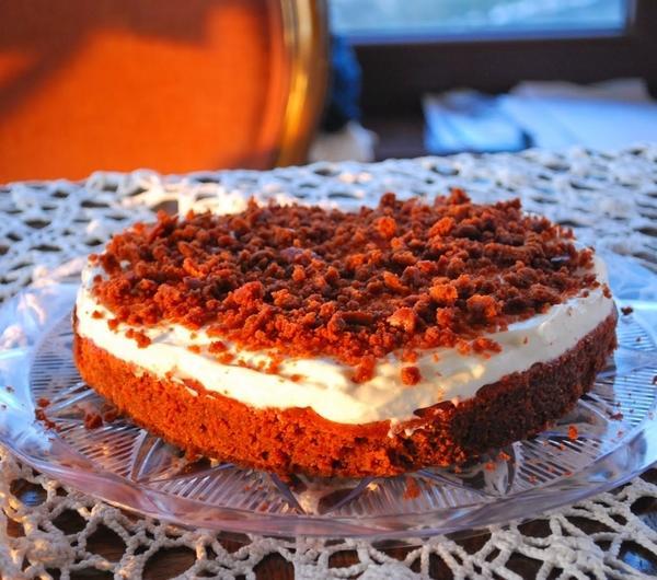 śmietanę i miksuję na niskich obrotach. Gotowy krem wykładam na ciasto. Całość posypuję przesuszonymi i wystudzonymi okruszkami. Smacznego!