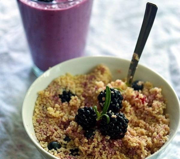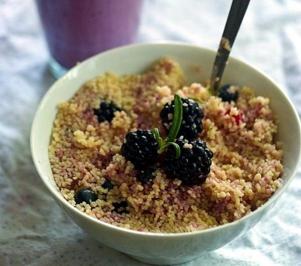 Kuskus nadaje się idealnie na lekkie, letnie śniadanie. W krajach arabskich przyrządza się go zarówno na słono jak i na słodko, więc owocowe połączenia także nie powinny nas dziwić. Wystarczy parę jabłek, malin lub truskawek, żeby otrzymać wachlarz śniadaniowych inspiracji. Najlepiej zalać go ciepłym sokiem, a jeżeli akurat takiego nie macie to zmiażdżyć parę owoców i takim musem polać kaszkę. Świetnie nadadzą się też inne dodatki: orzechy, rodzynki, suszone morele, żurawina, etc. Przygotowanie wszystkiego zajmuje zaledwie parę chwil.Mam dziś dla was kuskus w towarzystwie kwaśnych jeżyn, borówek, czerwonych porzeczek i...świeżego rozmarynu...ciężko do końca opisać to nietuzinkowe zestawienie. Zatem przekonajcie się sami, czy podbiło też wasze serca.A jako dopełnienie wszystkiego jeżynowo-porzeczkowo-borówkowo-jogurtowy smoothie. Pycha!***Sweet couscous with fruits and rosemaryCouscous seems perfect for a light, summer breakfest. In the arabic region it's often prepared in both ways: sweet and salty. That's why this fruity combination shouldn't be a suprise for us. You need just an apple, few raspberries or strawberries to achieve the full range of breakfest ideas. The best is to pour it with any warm juice, if you have just run out of it - mash few fruits and add them to your couscous. You can also use some other ingredients like nuts, raisins, dried apricots, cranberries and so on. Preparation process takes just a while.Today I've got for you couscous with blackberries, blueberries, currants and rosemary. It's really hard to descripe this falvour's combination. You need to try it so you can get know if you like it.The blackberry-blueberry-currant- yoghurt smotthie goes along just great!
