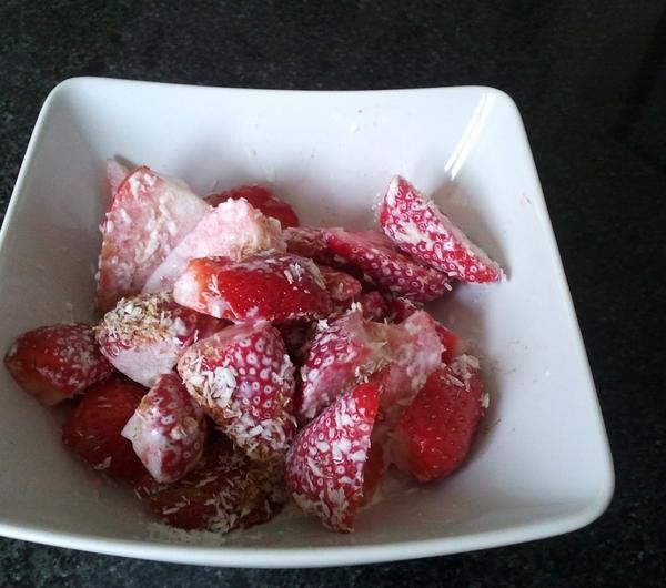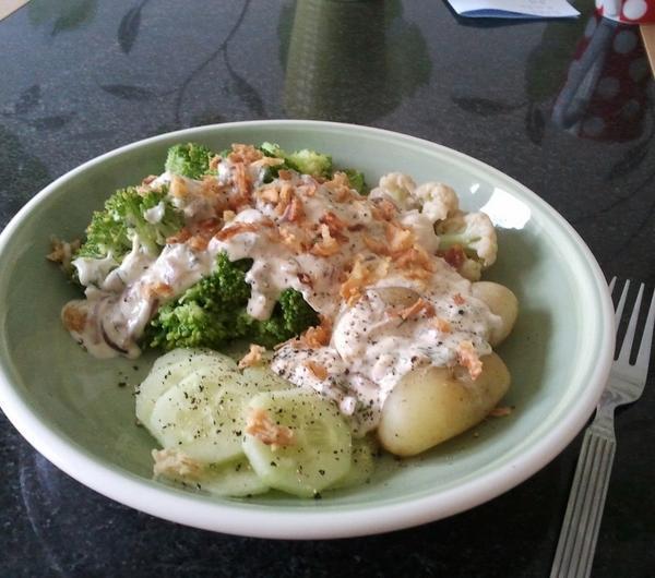 Młode ziemniaczki w sosie śmietanowo serowym z gotowanym brokułem i kalafioremPrzygotowanie jest bardzo proste.A do potrawy potrzebujemy:kilka młodych ziemniaków w skórce;nieduży brokuł;kilka różyczek kalafiora;200ml śmietany 30%;ser blue castello lub blue stilton;1 szalotka drobno pokrojona;pieprz, sól;łyżeczka masła;suszona cebulka do posypania(opcjonalnie);Brokuła, kalafiora i ziemniaki ugotować w lekko posolonej wodzie.W czasie kiedy warzywa sie gotują przygotowujemy sos serowy . Szalotkę podsmażamy na maśle, a następnie zalewamy ją śmietanką. Sos gotujemy przez ok 2-3 minuty a nastepnie wrzucamy rozdrobnione kawałki sera. Gotujemy przez chwilę aż sos zacznie gęstnieć. Na koniec doprawiamy świerzo zmielonym pieprzem.Ugotowane warzywa odcedzamy, wykładamy na talerz, dekorujemy świerzym ogórkiem lub innym ulubionym warzywem i całść polewamy sosem serowym. Po wierzchu posypujemy suszoną cebulą lub natką pietruszki. Gotowe:)A na deser:Truskawki w śmietanie obsypane wiórkami kokosowymi...