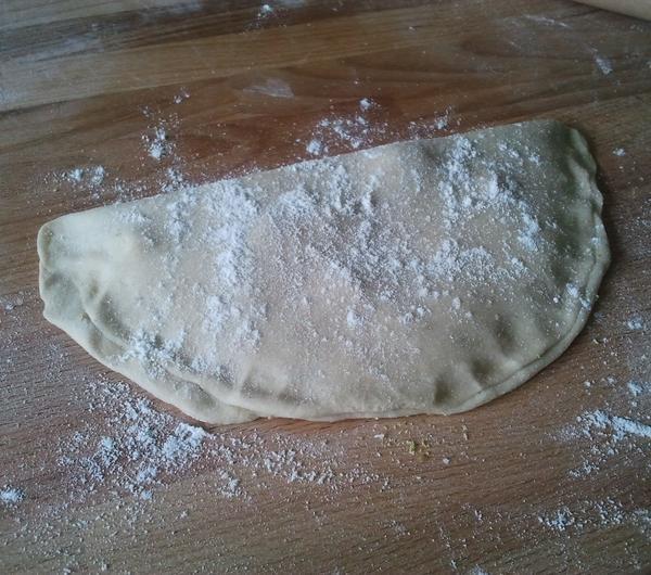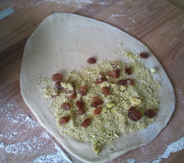 Ja dałam zmielone migdały, pistacje,wiórki kokosowe, rodzynki oraz zmielony kardamon.Tak przygotowane placki zawijamy na pół i zamykamy brzegi, a następnie lekko rozwałkowujemy.