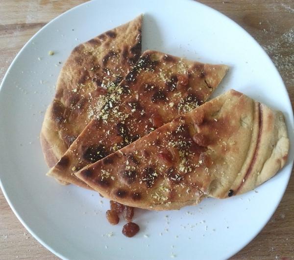 Wykonanie chlebków naan wymaga pewnej techniki. Mój wyszedł dość dobry smakowo, ale do oryginału to mu jeszcze brakuje. Mam jednak usprawiedliwienie, gdyż robiłam go pierwszy raz.Zainteresowanych odsyłam do filmiku, który znalazłam na YouTube, a oto link: http://www.youtube.com/watch?v=Cvf7-hIByTw .,Składniki na ciasto:150g mąki pszennej3 łyżki ciepłej wody2 łyżki jogurtu naturalnego1 łyżka rozpuszczonego masła1/2 łyżeczki sody oczyszczonej1 łyżeczka cukru1 łyżeczka suchych drożdżyszczypta soliZaczynamy od rozczynu. Mieszamy drożdże i cukier z wodą i odstawiamy na 10 minut. Mąkę przesiewamy, dodajemy rozczyn, masło, jogurt, sodę i sól. Wszystko razem łączymy i wyrabiamy na gładkie, sprężyste ciasto. Tworzymy kulę i odkładamy w ciepłe miejsce w lekko otłuszczonej misce do wyrośnięcia.Po około godzinie ciasto powinno podwoić objętość. Wyrabiamy go przez chwilę a następnie kroimy na dwie części. Każdą z nich rozwałkowujemy na owalne placki. Na połowie każdego z nich kładziemy ulubione bakalie.