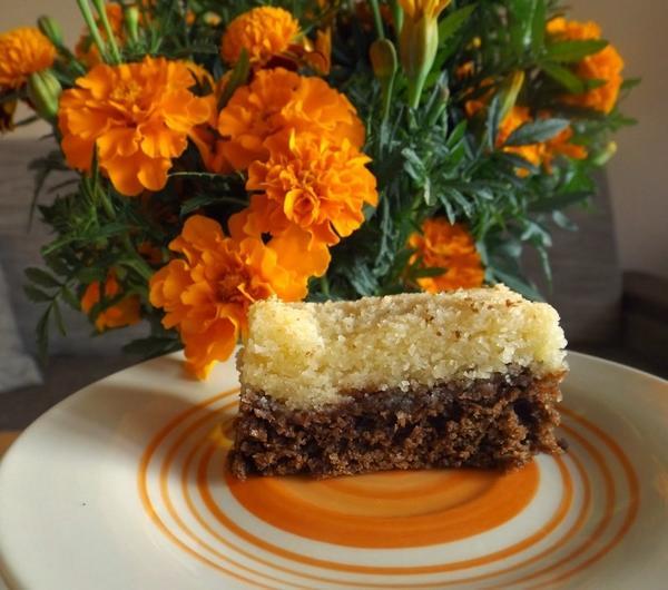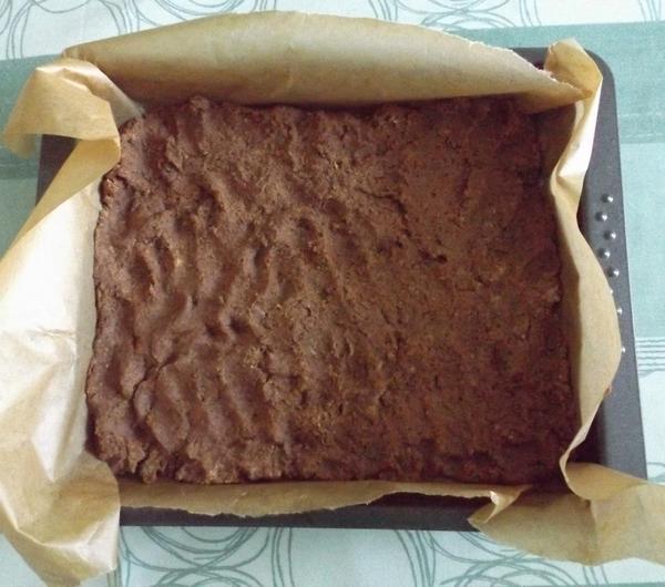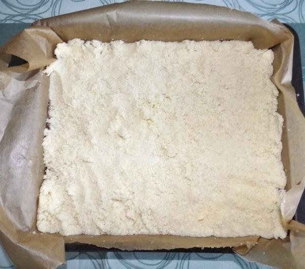 Składniki ciasta jasnego zagnieść i wyłożyć na ciasto ciemne, docisnąć.