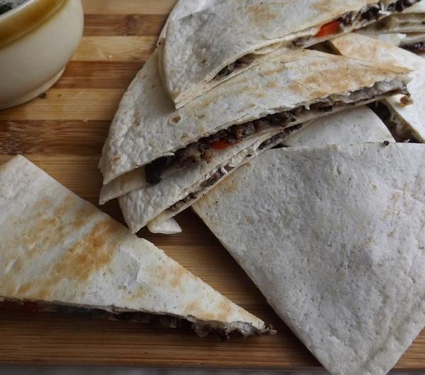 fetę. Przykryć drugą tortillą i całość przełożyć na patelnię. Podgrzaną obrócić na drugą stronę. Zapieczoną pokroić na trójkąty i zjadać maczane w