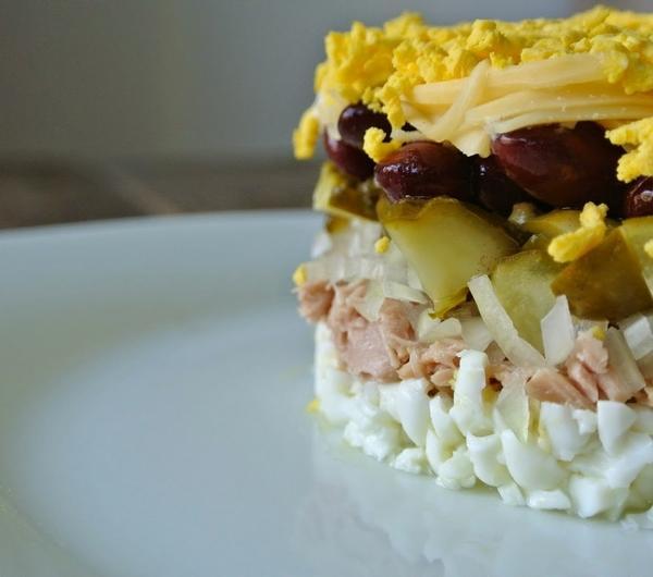 Jak to zwykle bywa ktoś narobi ochoty a później chodzi za człowiekiem taki tuńczyk. Tak też było w tym przypadku. Chyba ponad dwa tygodnie myślałam o tej sałatce, aż w końcu przy wolnej niedzieli mając chwilę doczekałam się mojego tuńczyka. Przepis raczej tradycyjny, z którym spotkałam się już wiele razy. Ameryki tutaj nie odkryłam, ale może akurat ktoś z Was jeszcze takiej sałatki nie przyrządzał.Składniki:-2 puszki tuńczyka w sosie własnym lub w oleju-5 jajek-1 mała cebulka-puszka fasoli czerwonej-ogórek konserwowy-ok. 1/4 kostki żółtego sera-3-4 duże łyżki majonezuSposób przyrządzenia:Jajka gotujemy na twardo. W między czasie odsączamy tuńczyka z zalewy. Gdy jajka się już ugotują oddzielamy żółtko od białka. Białko ścieramy na tarce o grubych oczkach. Na białku układamy warstwę tuńczyka i kolejno pokrojoną w kostkę cebulkę i ogórka konserwowego. Następnie odsączoną z zalewy czerwoną fasolę i starty na tarce żółty ser. Ser przykrywamy warstwą majonezu. Ilość tak na prawdę zależy od waszych upodobań. Na koniec żółtka ścieramy na drobnej tarce i gotowe.