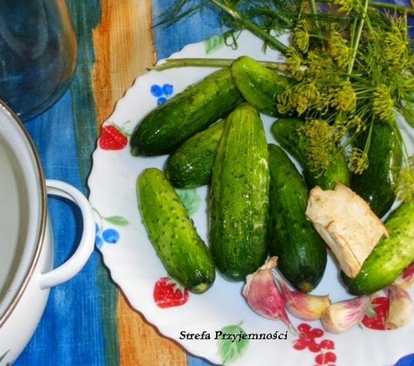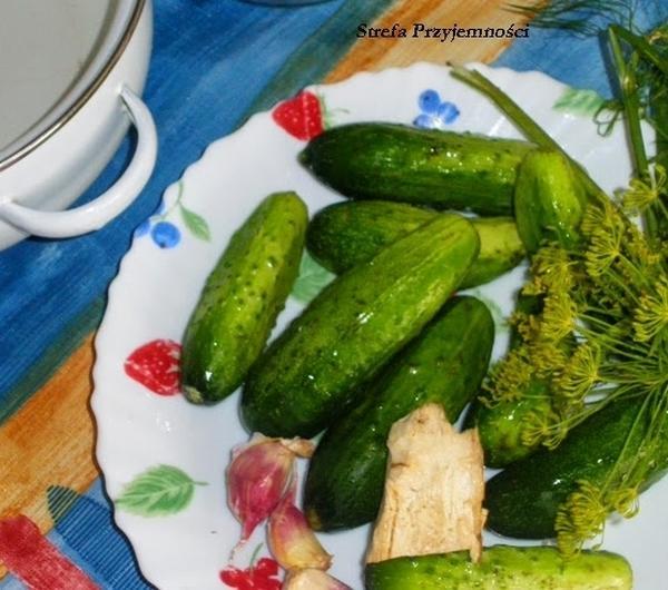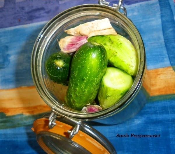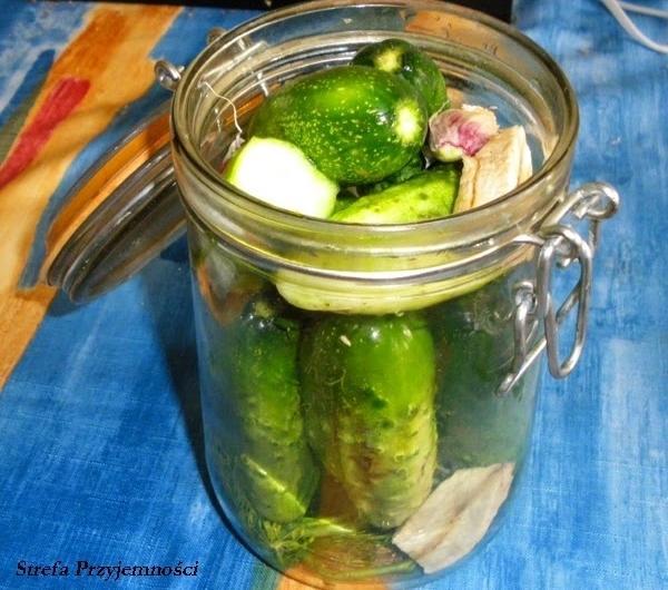 Składniki:1kg małych ogórków gruntowych1,5l wody2 łyżki soli2 ząbki czosnku2 cm korzenia chrzanuniewielka wiązka kopruPrzygotowanie:Sól rozpuszczamy w przegotowanej, gorącej wodzie. Garnek z wodą odstawiamy w chłodne miejsce, by zalewa ostygła. Do słoików na dno wkładamy koper, ząbki czosnku i chrzan. Umyte ogórki upychamy ciasno do słoików. Zalewamy ostudzoną wodą (ogórki muszą być przykryte wodą). Zakręcamy słoiki i odstawiamy w zacienione miejsce. Po 2-3 dniach ogórki będą gotowe do spożycia.Smacznego!