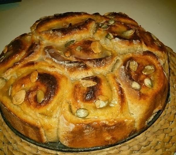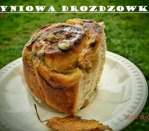 Gotowe, wyrośnięte ciasto przekładamy na blat posypany mąką i rozwałkujemy duży prostokąt grubości 0,5 cm. Dłuższy bok kładziemy przed sobą. Całość smarujemy nie za grubą warstwą nadzienia, aby nie wypłynęło nam przy krojeniu. Ciasto zwijamy w dosyć ciasną roladę. Kroimy na 10 równych części i układamy w natłuszczonej i obsypanej tortownicy.Przed pieczeniem drożdżówki smarujemy pozostawionym wcześniej jajkiem i posypujemy pestkami dyni.Wstawiamy na 30 min do piekarnika rozgrzanego do 180 stopni.Smacznego !