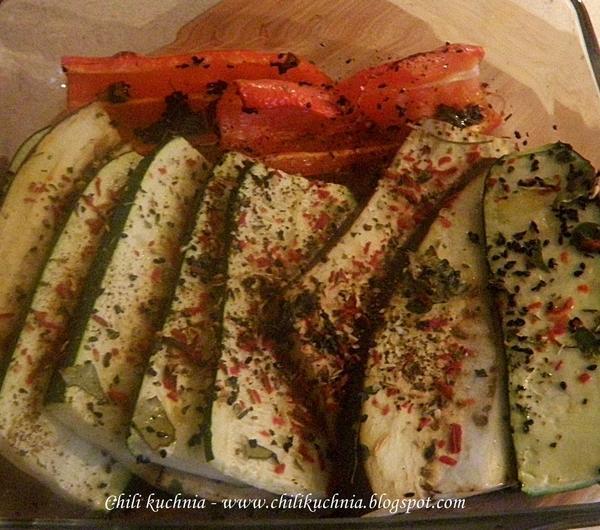 potem dokładnie go wypłukać. Pozwoli to na pozbycie się ewentualnej goryczy. Warzywa wkładamy do naszej miski i dokładnie mieszamy, aby dokładnie pokryły się naszą "marynatą". Opcjonalne można posolić nasze warzywa. Odkładamy je na 10-15 minut. Następnie przekładamy je na blachę lub do naczynia żaroodpornego i wkładamy do piekarnika rozgrzanego do 200 stopni. Czas pieczenia zależny od tego, na jakie warzywa się zdecydowaliście. U mnie było to 15 minut. Przy