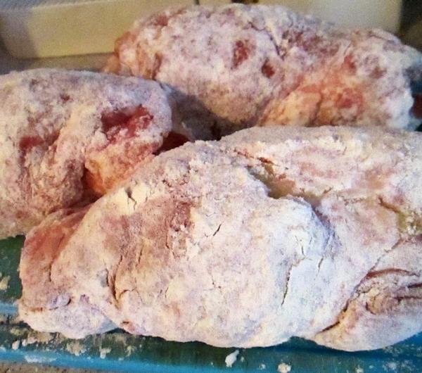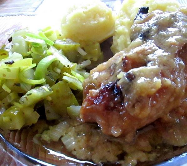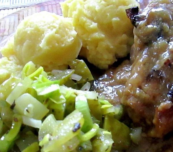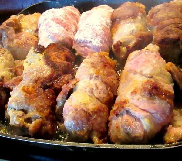 Składniki:(na 5 sztuk)- 5 kawałków karkówki- 0,5 kg mięsa mielonego- słoik musztardy- 3-4 ogórki kiszone- mąka do obtoczenia mięsa- 2 cebule- kostka rosołowaSposób przygotowania:1.Kawałki karkówki myjemy i tłuczemy na cienkie kotlety. Mięso mielone przyprawiamy pieprzem solą i dzielimy je na 5 części i z każdej formujemy "kulkę". Ogórki kroimy w paski.Bierzemy karkówkę i smarujemy ją sporą ilością musztardy. Na środek kładziemy 2-3 paski ogórka i "kulkę" mięsa mielonego. Zawijamy karkówkę i obtaczamy w mącę tak jak na zdjęciu :