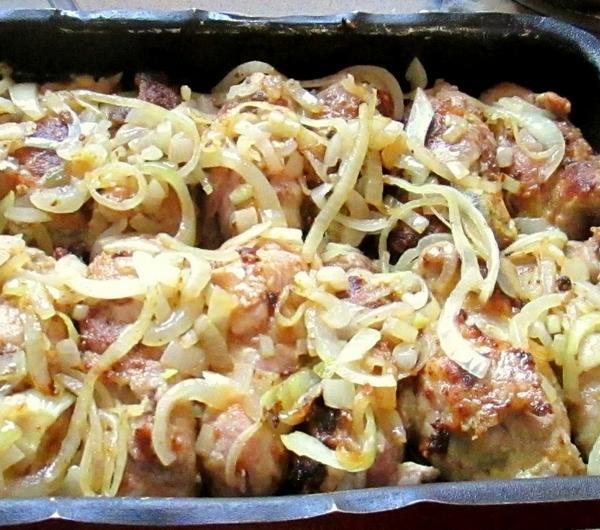 Następnie wykładamy je na blachę. Obieramy i kroimy cebulę w piórka i kładziemy ją na zrazy.