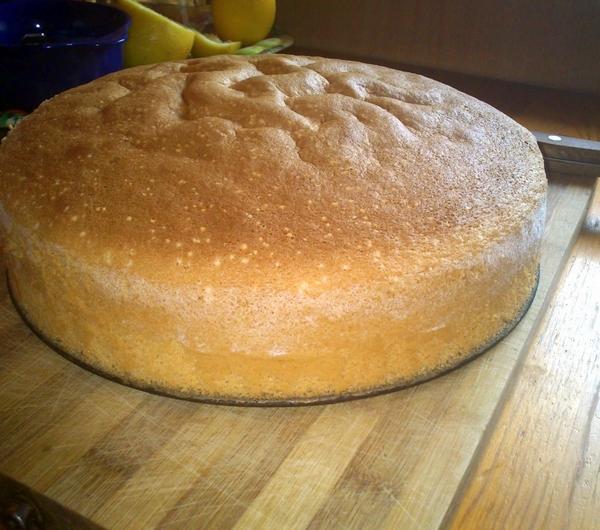 biszkopt pozostawiamy do wystygnięcia, (ja zaraz po wyjęciu z piekarnika upuszczam go z niewielkiej wysokości na blat stołu). Następnie wyjmujemy z formy i przekrawamy nożem na pół, jak pokazano na poniższym zdjęciu: