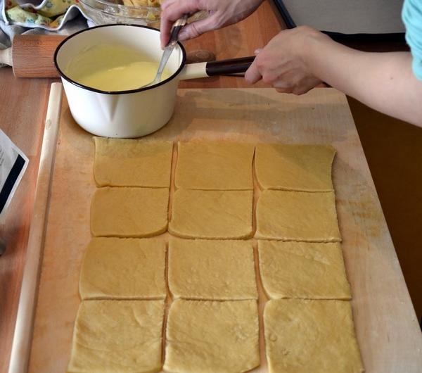 mleku. Ciasto cienko rozwałkować i pokroić w kwadraty (ok. 9x9cm). Na każdy nałożyć porcję budyniu, złożyć w trójkąty i dokładnie zlepić brzegi.