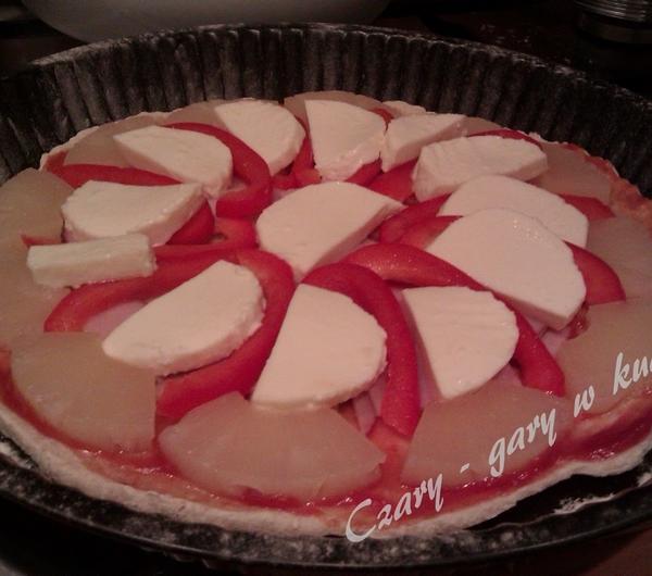 Plastry ananasa kroimy na cztery części każdy, paprykę w paski, szynkę w kostkę, a mozzarellę w plastry - oczywiście to taka moja sugestia, bo możecie sobie to nadzienie pokroić zupełnie dowolnie :-). Podpieczony spód smarujemy ketchupem i układamy pokrojone składniki. Pieczemy 12 - 15 minut w 180 stopniach (czas pieczenia zależy głównie od tego jak bardzo chcecie mieć rozpuszczoną i przypieczoną mozzarellę). I gotowe! Prawda, że szybko?