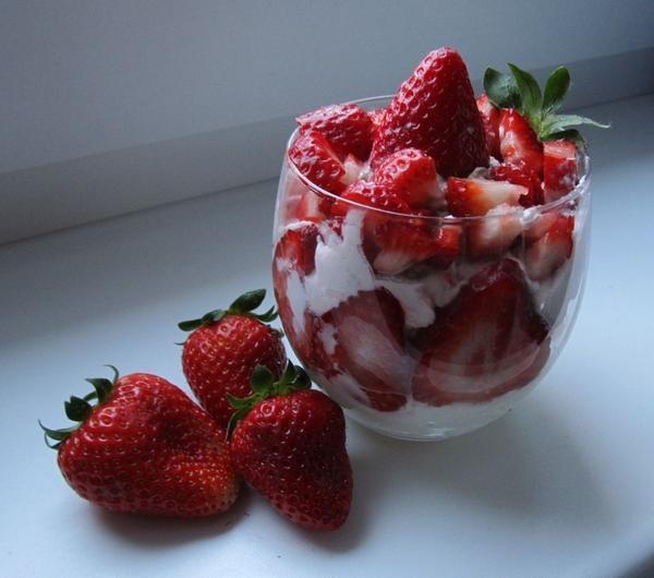Z reguły unikam spożywania produktów o wysokim indeksie glikemicznym, zawierających węglowodany proste. Oczywiście nie mam tu na myśli, np. owoców, które posiadają niewiele cukrów prostych i nie wpływają niekorzystnie na nasze zdrowie. Złem w czystej postaci są tu produkty przetworzone, wysokokalorycze, czyli wszelkiego rodzaju słodycze. Jak się okazuje, z fizjologicznego punktu widzenia nie trudno o uzależnienie od węglowodanów- a ma na nie wpływ prosty mechanizm: konsumujemy wysokokaloryczny produkt, po czym następuje gwałtowny wzrost cukru we krwi, a tym samym odczuwamy podwyższenie energii, także chwilowe podniesienie nastroju (w końcu słodycze dobre na "zajedzenie" smutku:)). Organizm szybko reaguje wydzielając dużą dawkę insuliny, która z kolei gwałtownie obniża poziom cukru we krwi. W tym momencie odczuwamy spadek energii i nieodpartą chęć sięgnięcia po kolejną słodkość... W efekcie, tego typu nieprawidłowe nawyki żywieniowe mogą powodować zaburzenia w gospodarce węglowodanowej, co może prowadzić do powstania cukrzycy. Nie strasząc nikogo, a jedynie przytaczając suche fakty- cukier jest także pożywką raka. Nowotwory potrzebują cukru dla rozwoju, dlatego zasadniczym, pierwszym krokiem w walce z nimi jest modyfikacja diety, polegająca na eliminacji z niej cukrów. Celem jest odcięcie nowotworom ich pożywienia, wskutek czego spowalniamy ich rozwój.Ja właściwie zaprzestałam używać cukru i po określonym czasie mój organizm się od niego odzwyczaił. Wszelkiego rodzaju słodkości, desery itp. są dla mnie po prostu za słodkie i spożywane w większej ilości wręcz niesmaczne, mdlące (zaznaczam, że dla mnie większa ilość to już taka, która dla innych, nie ograniczających spożycia cukru, jest powiedzmy dawką małą lub przeciętną). Cieszę się naturalnym smakiem potraw. W moim mniemaniu dosładzanie choćby herbaty czy kawy to pozbawianie ich prawdziwego aromatu- niestety zrozumiałam i doceniłam to dopiero kilka lat temu. Oczywiście od czasu do czasu pozwalam sobie na małe grzeszki, i nie traktuję ich jako jakiejś szczególnej uczty dla mojego organizmu (raczej wręcz przeciwnie). Głównie ze względu na lenistwo, często rzekomy brak czasu (chociaż obstawiam tu mimo wszystko lenistwo, bo nie lubię szukać usprawiedliwień swoich złych działań poza sobą), próbuję oszukać organizm i "zapycham głód" czymś sycącym, by mieć to chwilowe złudzenie "mocy". Można by to osiągnąć innym sposobem, odpowiednio bilansując swoją dietę, wykorzystując choćby idealne działanie węglowodanów złożonych. Są one dłużej trawione przez nasz układ pokarmowy, dlatego powoli dostarczają nam energii, zaspokajając głód przez cały dzień. W przeciwieństwie do cukrów prostych, cukry złożone w dużym stopniu są na bieżąco spalane przez nasz organizm, co znacznie zmniejsza, a u niektórych wręcz eliminuje problem ich odkładania się w tkankę tłuszczową. A plaga otyłości w dzisiejszych czasach tylko potwierdza to jak bardzo źle się odżywiamy. Tylko pozornie walka typu- ciasta/czekolady vs produkty pełnoziarniste/owsianka jest nierówna. To kwestia podejścia, przyzwyczajeń. Zazwyczaj w tej kwestii nasz organizm jest sprawiedliwym sędzią, co niekoniecznie wszystkim się podoba :)Zaproponowany deser to mój mały grzeszek, zrobiony na szybko, pod wpływem tego, że w sklepie po prostu rzucił mi się w oczy serek mascarpone... grzeszek powodowany bardziej chęcią stworzenia deseru niż jego konsumpcją. Jednak zjadłam by móc ocenić, co z tego wyszło i myślę, że Wam (lubiącym słodycze) bardziej by smakowało niż mnie! :) Bazą jest tu bardzo smaczny serek mascarpone. Zatrważające nieco jest to, że wykorzystane 250g serka (co daje trzy porcje), zawiera 985 kalorii, w tym prawie 13g węglowodanów, na porcję ponad 300 kalorii, a do tego trzeba dołożyć kalorię ze śmietany kremówki, cukru pudru i z samych truskawek- może lepiej tego nie podliczać:p Spokojnie od razu od tego się nie umiera, a jak mawiają- raz się żyje i czasem można. Jak inaczej poznać "smaki życia', tylko próbować, próbować ;)Zaznaczam, że powyższy wywód (na marginesie- będący raczej "zniechętą" do spożycia tego deseru, lecz ja wolę mieć czyste sumienie :p) nie dotyczy sportowców, ludzi stosujących duży wysiłek fizyczny. W tym wypadku mamy do czynienia z innym zapotrzebowaniem energetycznym i z innym tempem spalania. Tego typu osoby mogą z odrobinę mniejszym poczuciem winy skonsumować ten deser, pomińmy jednak tę kwestię.