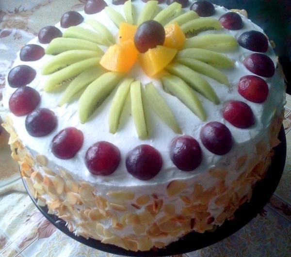 Składniki:8 jajek1,5 szklanki mąki tortowej3 łyżki mąki ziemniaczanej1,5 szklanki cukru2 łyżeczki proszku do pieczenia---puszka brzoskwiń5-6 kiwigalaretka brzoskwiniowagalaretka o smaku kiwi2,5 szklanki gorącej wody2 śnieżki2 szklanki mleka1 łyżeczka żelatynymigdałyowoce do dekoracjiBiałka ubić na sztywno, dodać cukier, żółtka i przesiane mąki z proszkiem. Miksować chwilę. Wylać ciasto do tortownicy , piec ok. 35 min. Po upieczeniu przekroić ciasto na 3 części.Galaretkę brzoskwiniową rozpuścić w 1 szklance gorącej wody. Brzoskwinie pokroić drobno, zalać galaretką. Gdy trochę zastygnie rozsmarować ją na spodniej części tortu. Przykryć drugim ciastem.Galaretkę o smaku kiwi rozpuścić w 1 szklance wrzątku. Kiwi obrać i pokroić na drobną kosteczkę. Przesmażyć. Zalać galaretką. Tak jak poprzednio, gdy lekko stężeje rozsmarować na środkowej części.Śnieżki ubić z mlekiem, dodać 1 łyżeczkę żelatyny rozpuszczonej w 0,5 szklanki gorącej wody. Gdy śmietana stężeje rozsmarować ją na wierzchu tortu i po bokach. Na śmietanie układać owoce według uznania. Migdałami obtoczyć boki tortu. Trzymać w lodówce.