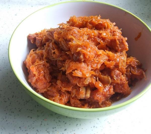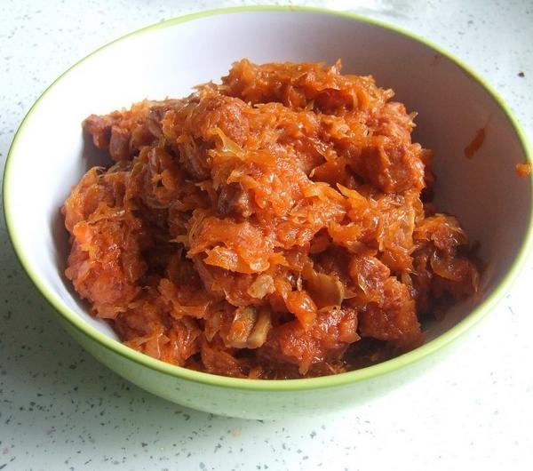kapusta będzie miękka, przełożyć zawartość patelni do garnka. Gotować jeszcze z pół godziny. Podsmażyć pokrojone