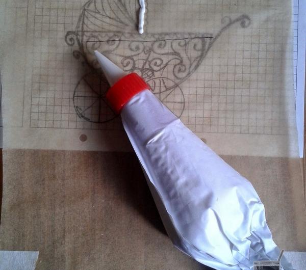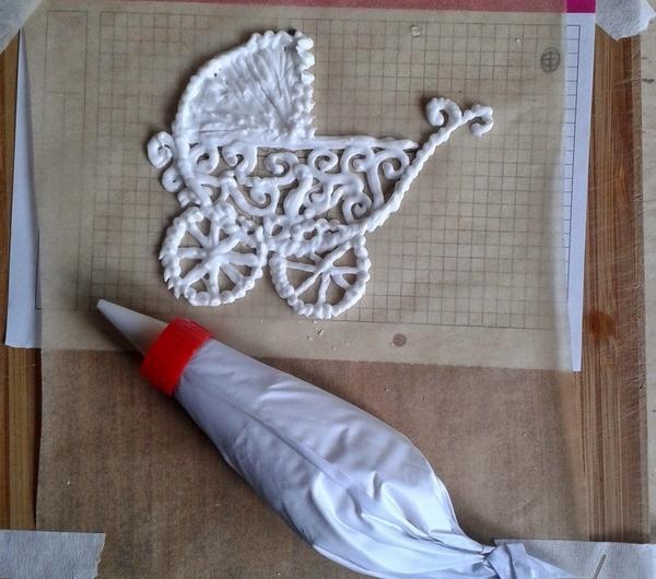 Dziś pokażę Wam jak w prosty sposób uzyskać niebanalną ozdobę do każdego tortu czy ciasta.Lukier królewski to bardzo wdzięczny materiał do pracy. Rzadsza jego wersja jest idealna do pomadowania ciasteczek i pierniczków. Ta bardziej gęsta służy do wytwarzania wspaniałych ozdób cukierniczych.Wózek wykonany z luru królewskiego był tzw. "kropką nad i" tortu, jaki wykonałam dla synka z okazji Chrztu Świętego.Idealny lukier zrobiłam z proporcji podanych na Moich Wypiekach (klik).U mnie zrobiony z połowy porcji. Lukier ma być tak gęsty, że postawiona kropla na stole stoi a na jej powierzchni robi się po chwili cienka skorupka.A oto wykonanie wózeczka z luru krok po kroku:1. Przygotowujemy:- kartki papieru i pisak do szkicowania- papier do pieczenia / lub sztywna folia- taśma klejąca- szeroki krążek ( u mnie również szeroka taśma klejąca)- dodatkowo: worek cukierniczy z tylką w kształcie ściętego stożka