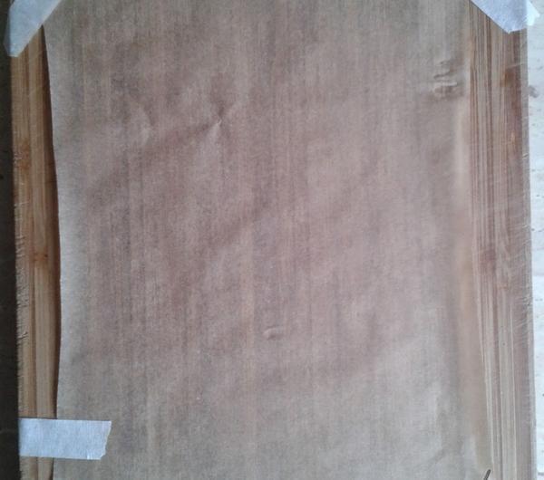 4. Następnie do podłoża taśmą klejącą przytwierdzamy papier do pieczenia ( zapobiegnie przesuwaniu się arkusza)